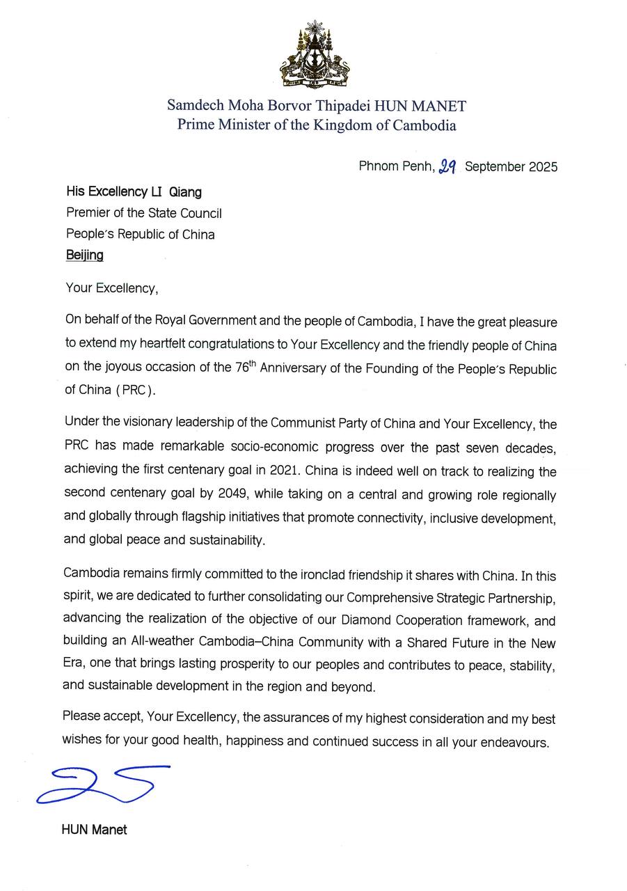 សារលិខិតអបអរសាទរ របស់ សម្ដេចមហាបវរធិបតី ហ៊ុន ម៉ាណែត នាយករដ្ឋមន្ត្រីនៃព្រះរាជាណាចក្រកម្ពុជា ជូន ឯកឧត្តម លី ឈាង នាយករដ្ឋមន្ត្រី នៃសាធារណរដ្ឋប្រជាមានិតចិន ក្នុងឱកាសដ៏រីករាយ នៃខួបលើកទី ៧៦ នៃការបង្កើតសាធារណរដ្ឋប្រជាមានិតចិនBy សហការី / 09/30/2025 សារលិខិតអបអរសាទរ របស់ សម្ដេចមហាបវរធិបតី ហ៊ុន ម៉ាណែត នាយករដ្ឋមន្ត្រីនៃព្រះរាជាណាចក្រកម្ពុជា ជូន ឯកឧត្តម លី ឈាង នាយករដ្ឋមន្ត្រី នៃសាធារណរដ្ឋប្រជាមានិតចិន ក្នុងឱកាសដ៏រីករាយ នៃខួបលើកទី ៧៦ នៃការបង្កើតសាធារណរដ្ឋប្រជាមានិតចិន។