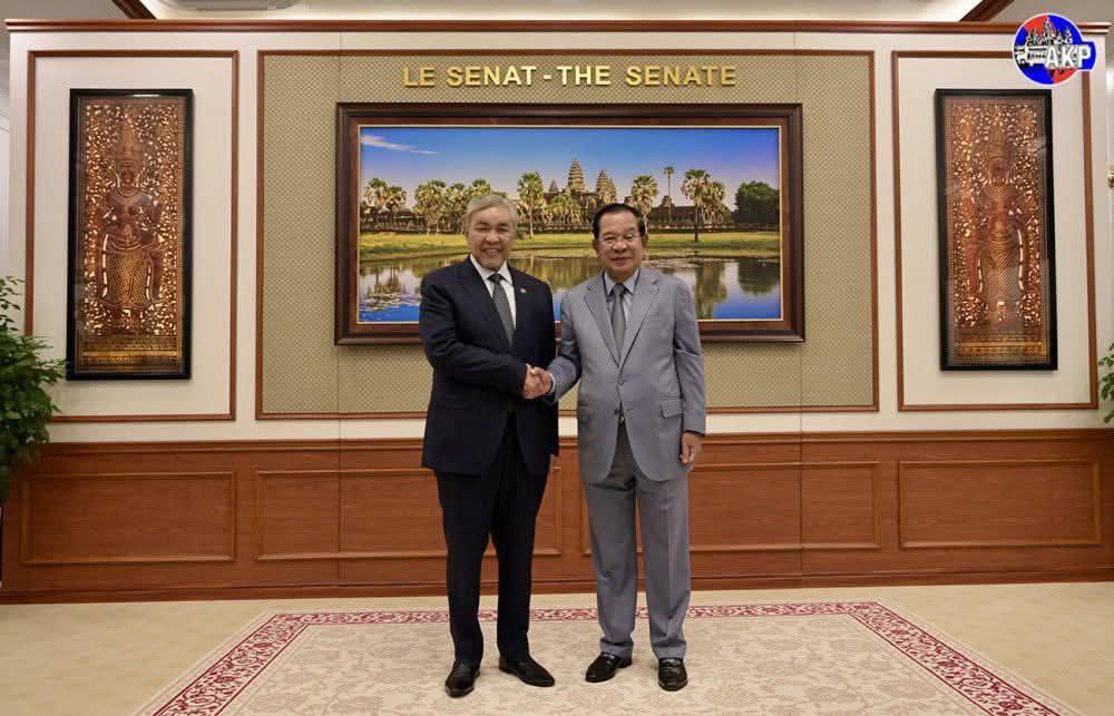 សម្ដេចអគ្គមហាសេនាបតីតេជោ ហ៊ុន សែន ប្រធានព្រឹទ្ធសភា នៃព្រះរាជាណាចក្រកម្ពុជា អនុញ្ញាតជូនឯកឧត្តម Datuk Seri Dr. Ahmad Zahit Hamidi ឧបនាយករដ្ឋមន្ត្រី រដ្ឋមន្ត្រីក្រសួងអភិវឌ្ឍន៍ជនបទ និងតំបន់ នៃប្រទេសម៉ាឡេស៊ី និងជាប្រធានគណបក្សរួបរួមជាតិម៉ាឡេស៊ី (UMNO) ចូលជួបសម្ដែងការគួរសម និងពិភាក្សាការងារ នៅវិមានព្រឹទ្ធសភា រាជធានីភ្នំពេញ នាព្រឹកថ្ងៃទី១៤ ខែតុលា ឆ្នាំ២០២៥ ក្នុងឱកាសដែលឯកឧត្តម ឧបនាយករដ្ឋមន្ត្រី អញ្ជើញមកចូលរួមកិច្ចប្រជុំគណៈកម្មាធិការគ្រប់គ្រងគ្រោះមហន្តរាយអាស៊ាន លើកទី៤៧ (47th ACDM) ដែលនឹងរៀបចំ នៅរាជធានីភ្នំពេញ។